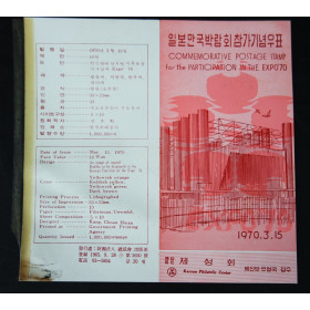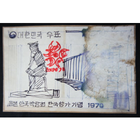 일본 막국박람회 한국참가기념 우표의 스케취(강춘환), 우표발행 안내장, 엑스포 로고 2매,