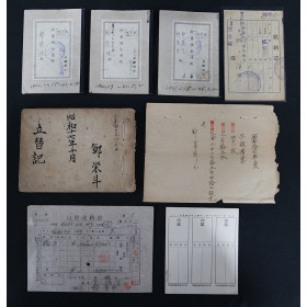 금융조합통장 3매, 인감신고서용지, 물품 수납증, 양곡수납증, 공판전표, 입체기 등 정영채가의 문서 일괄.