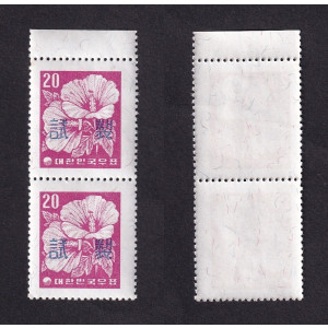 1957년 12월18일 발행의 무궁화 20환 우표의 종 2매 시쇄품으로 상변지가 붙은 상태로 최상의 상태이다.