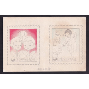 4293년(1960년) 1월 8일 강춘환선생님의 싸인이 있는 식목장려우표의 원도로 어린이 모습의새싹, 새싹에 물주는 어린이를 도안으로 하고 있으며, 원도의 뒷면에는 항공우표를 발행할 때 사용하기 위한 듯 항공기의 모습이 스케취 되어있다.