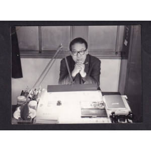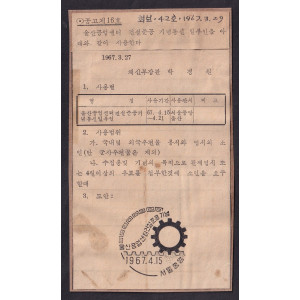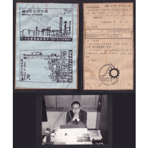 1967년 울산공업쎈터 건설준공기념우표 스케취 2점과 통신일부인 사용 공문 1점, 강춘환 선생님의 사진 1점 등 일괄자료